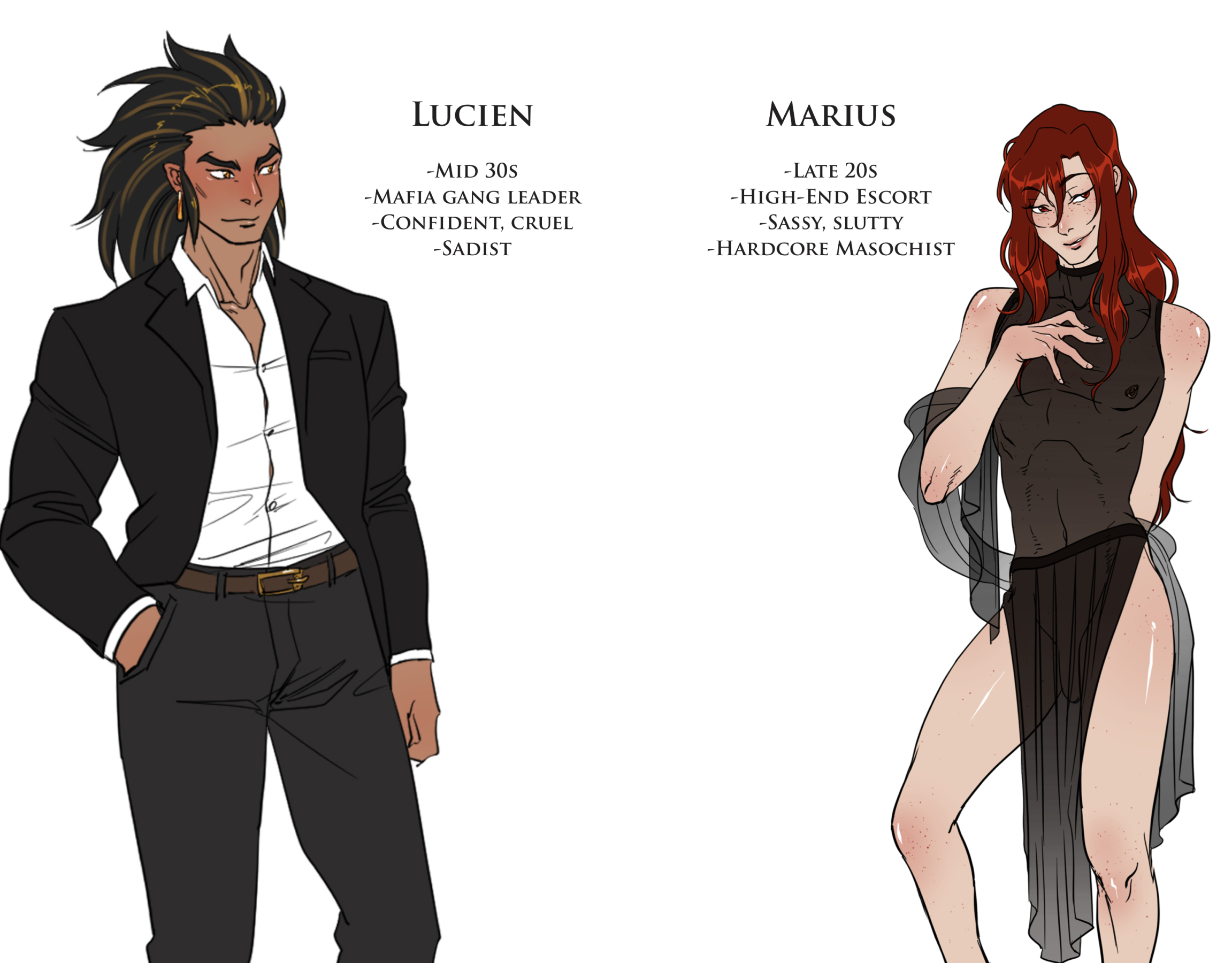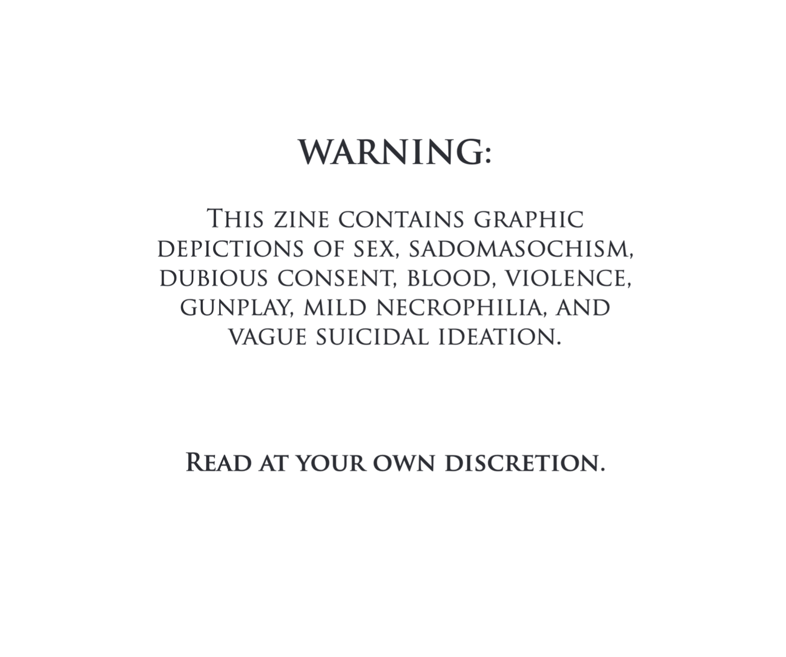 Content warnings include graphic depictions of sex, sadomasochism, dubious consent, blood, violence, gunplay, mild necrophilia, and vague suicidal ideation. READ AT YOUR OWN DISCRETION.